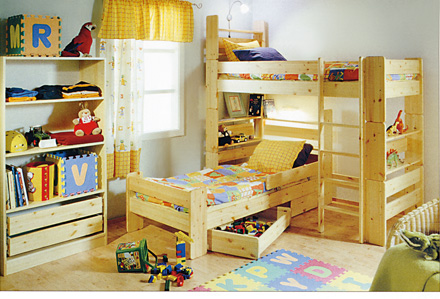 Детская мебель состоит из кровати и лежанки Индивидуальная кровать предназначена для растущего ребенка. Прочная конструкция, размеры и тщательно продуманные детали обеспечивают возможность ее использования как в качестве индивидуальной кровати, так и как часть комплекта.Лежанка позволяет придать обстановке комнаты новый облик.Лежанка занимает небольшую площадь и позволяет использовать освобождающиеся место для других целей. Одновременно торцевая этажерка лежанки образует естественное место для хранения вещей.