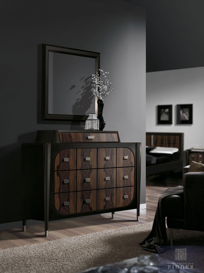 Комод, серия «Винтаж», испанской фабрики Lino. Мебель может быть выполнена в черном и белом цвете. Ящики и пилястры могут быть шпонированы полисандром, покрыты сусальным золотом, серебром.